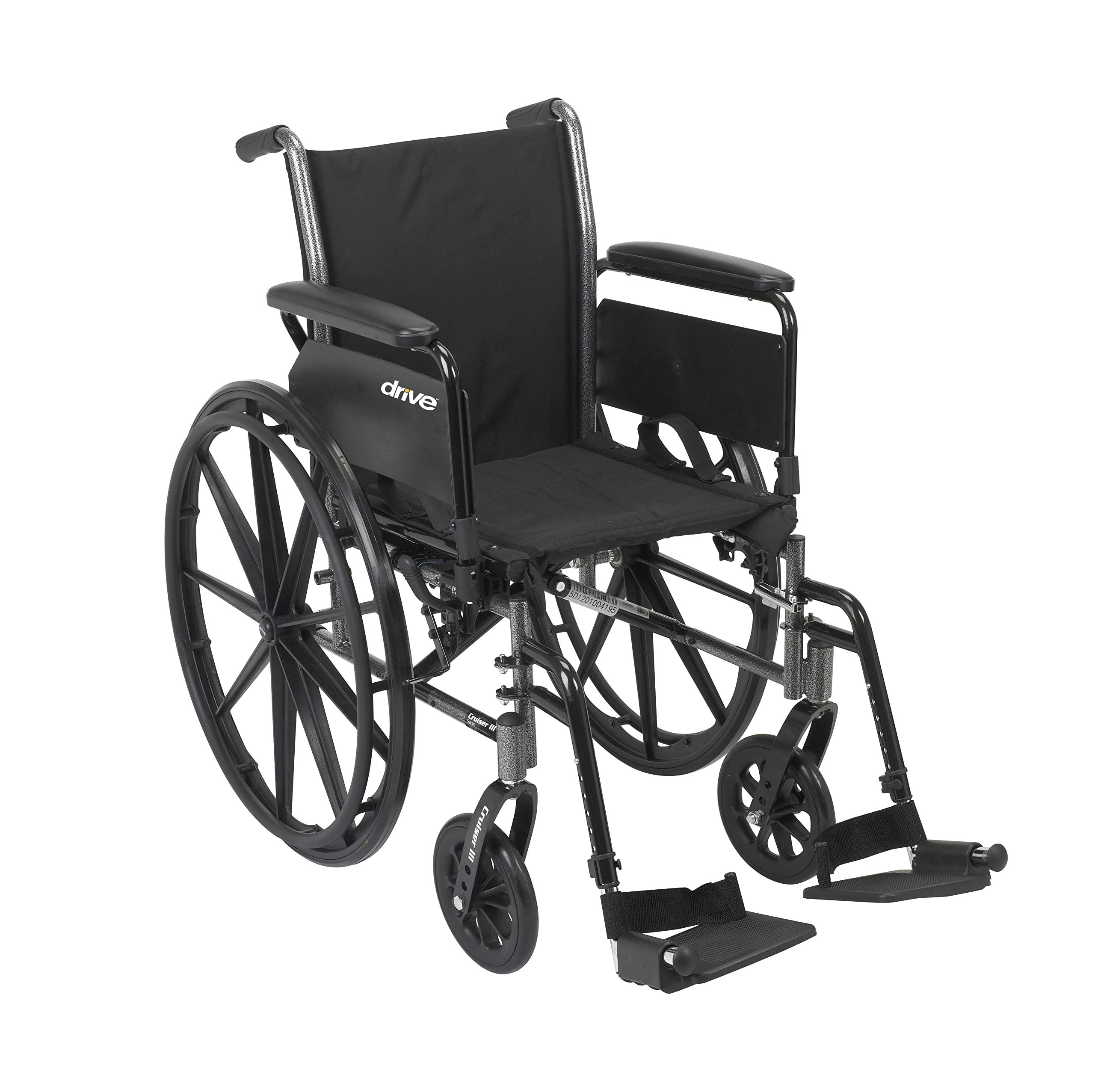 The Drive Medical 16" Cruiser III Wheelchair with Flip Back Detachable Full Arms and Swing Away Footrests is a durable, easy-to-maneuver lightweight wheelchair that is loaded with features to provide excellent value. With precision-sealed wheel bearing in front and rear to ensure long-lasting performance and reliability and 8-inch front caster wheels for a smooth ride over most surfaces, this model comes with a 16-inch seat, detachable flip-back full arms, footrests that can be moved to the side, black nylon upholstery, composite Mag-style wheels, and push-to-lock wheel locks. Multiple tool-free adjustments can be made for custom comfort: the adjustable wheelchair seat extends two extra inches, 8-inch casters can be adjusted to three heights, elevating leg supports can be raised or lowered, and flip-back arms can be detached. Weighing 35 pounds, the portable wheelchair is easy to fold to a compact 12-inch width and can easily stow in storage or trunk. Backed by a limited lifetime warranty from Drive Medical, a leading brand of mobility aids and other medical goods for more than 20 years, the Cruiser III is a durable lightweight wheelchair for adults and seniors suitable for both temporary and everyday use.