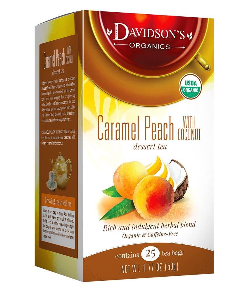 - Caramel Peach with Coconut combines coconut, caramel and peach essence with a base of creamy chicory, barley and South African rooibos, making the blend a perfect caffeine-free dessert alternative with only 3 calories per cup. Davidson's Caramel Peach with Coconut is a decadent, buttery blend complemented by the flavor of sun-ripened peaches.