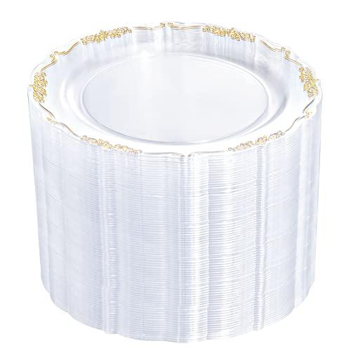 - HEALTY AND SAFETY: Our gold plastic plates disposable and plastic plates not only look stunning but are also very sturdy. we are proud to say that our clear and gold dessert plates are BPA-free and recyclable too! It is the perfect balance between elegance and fancy plastic plates.