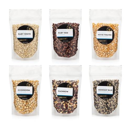 - SIX HEIRLOOM VARIETIES: This variety pack includes Baby White, Classic Movie, Midnight Blue, Mushroom, Rainbow and Ruby Red kernels