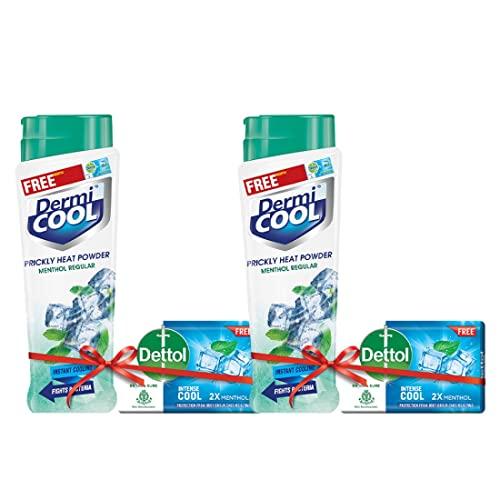 Dermicool Menthol Regular Prickly Heat Powder 150g (Pack of 2) | Dettol Cool Soap 125g Free