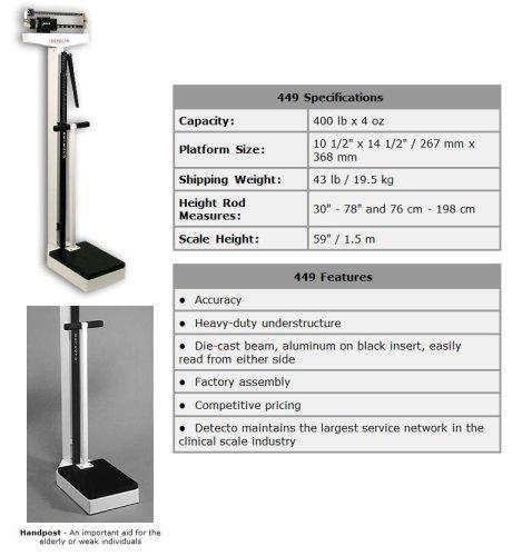Detecto's model 449 features a height rod in inches and centimeters and a handpost, which is an important aid for the elderly or weak individuals. The platform cover is easily removed for cleaning. The die-cast beam can be easily read from either side. Detecto continues to set the pace in the clinical scale industry, backed by over a century of leadership. Every Detecto physician scale features a time-honored reputation for rigid construction and precision engineering. This assures an unbeatably rugged product that guarantees accuracy and durability. All Detecto scales are tested with weights traceable to the U.S. Bureau of Standards.