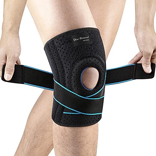 Secured with four strong fastener straps, the DocBraces strap knee support easily adjusts to fit most adults. The open patella design relieves pressure on the knee cap while providing stabilizing support for ACL, PCL, or MCL injuries, for helping relieve strains, sprains, and for knee pain.