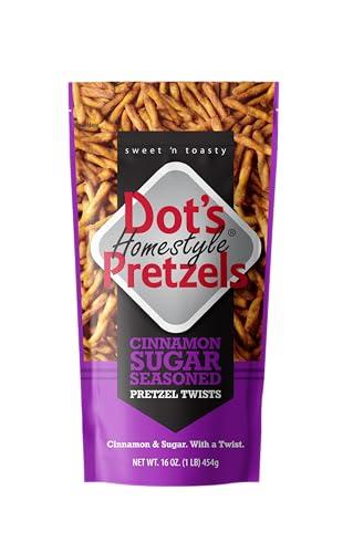 - Dot's Cinnamon Sugar Pretzel Twists are baked to perfection and specially seasoned with a blend of sweet and toasty spices. Receive one 16oz resealable bags that are perfect for any snacking occasion