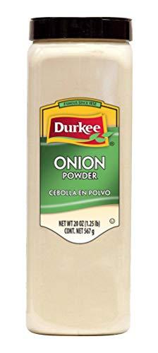 Durkee Onion Powder - 20 oz. container, 6 per case A pure fine onion powder processed from superior strains of dehydrated white onions. The flavor of this product is very similar in characteristics to garlic, but is much milder and much sweeter. Use wherever a fresh onion flavor is desired or when a true onion flavor is needed without the actual onion appearance or texture. Use as a sprinkle on for meats or mix into salads, gravies, sauces, cream soups, dips and appetizers. Delicious in mashed potatoes, casseroles or meatloaf.Use in dry form or combine with just enough water to form a paste. One pound of Durkee Onion Powder is equivalent to the flavor of 10 pounds of raw, prepared, finely ground onions. One teaspoon of Durkee Onion Powder equals 3 tablespoons fresh minced onion.