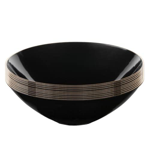 - BLACK & GOLD ROUND BOWLS: Whether it's an at home party or corporate event, these black and gold round plastic bowls will add to your decor and your table setting. With their beautiful black color and gold rim design they are sure to be a hit! Next dinner table in a breeze with style! Great for Soups & Desserts!