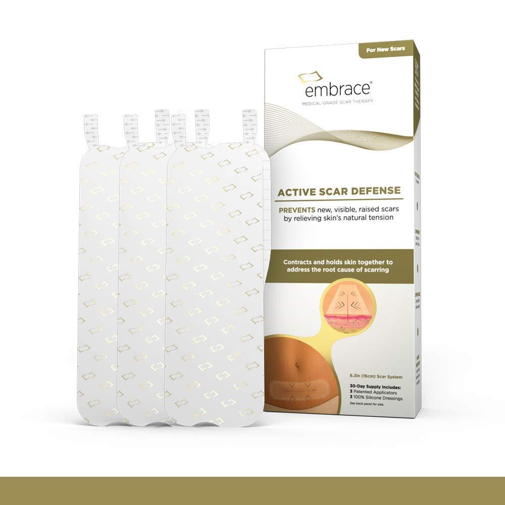 - Items Delivered: 3 x extra-large (6.3) Embrace Active Scar Defense tension-relieving silicone dressings with applicators for new scars 30-day supply