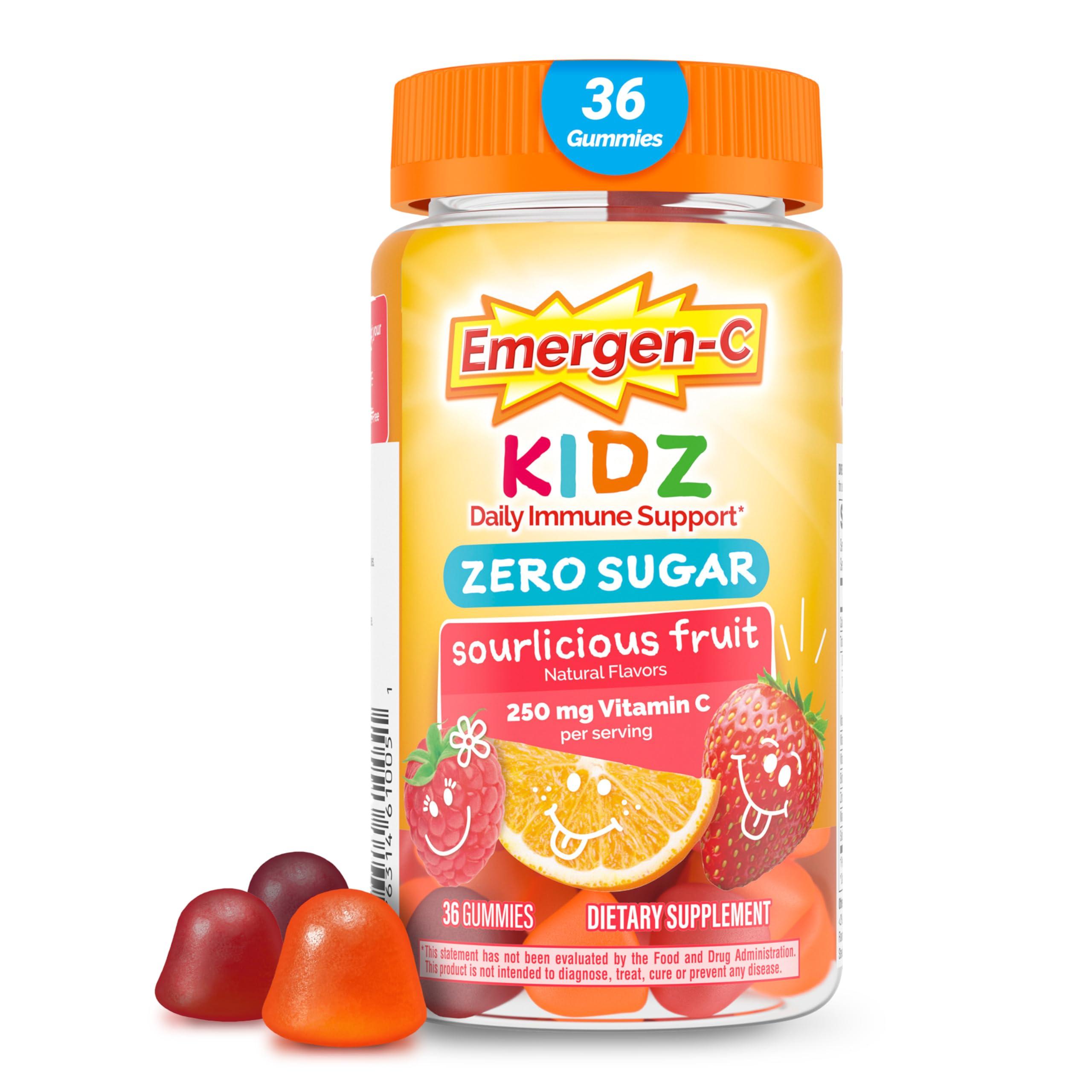 - 36 Count Zero Sugar Emergen-C 250 mg Vitamin C per serving Kidz Gummies for Daily Immune Support (1) sourlicious fruit flavor