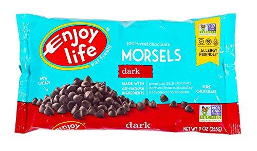 Includes: (4) 9 ounce package of Enjoy Life Dark Chocolate Regular Size Morsels (Chocolate Chips). Ingredients: Unsweetened Chocolate, Cane Sugar. *Certified GLUTEN-FREE! *FREE FROM THE 8 COMMON ALLERGENS! *ALLERGY FRIENDLY. This product is free from: wheat and gluten, dairy, peanuts, tree nuts, egg, soy, fish, shellfish. Also made without casein, potato, sesame, and sulfites. *Non-GMO Project Verified. *America's #1 Allergy Friendly Baking Chocolate! Great for baking or snacking! *Made in the USA! *Made by Enjoy Life. "Eat Freely." At Enjoy Life, their whole business is making smile-good foods that keep people's insides happy. That's why all of their foods are specifically made to be gluten-free and free of the 8 most common allergens. Their goal is to make delicious products that just about everyone can EAT FREELY. We promise they'll make you smile inside out!