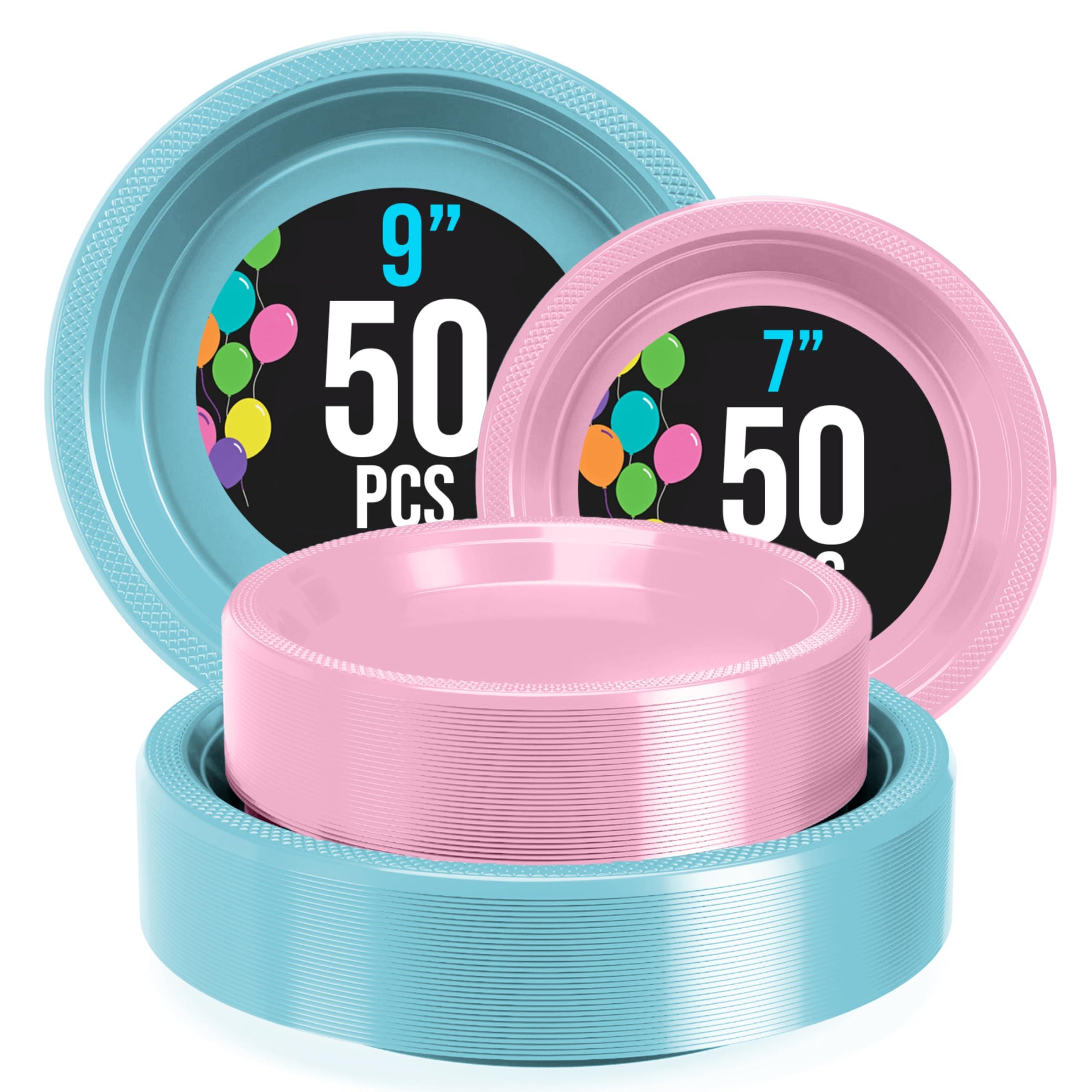 - Includes: Each pack comes with 50 Light Blue 9 inch dinner plates & 50 Pink 7 inch dessert plates These plates may be used as dinner plates or cake plate and also make a great use as picnic supplies. Having these will complete your plastic dinnerware collection.