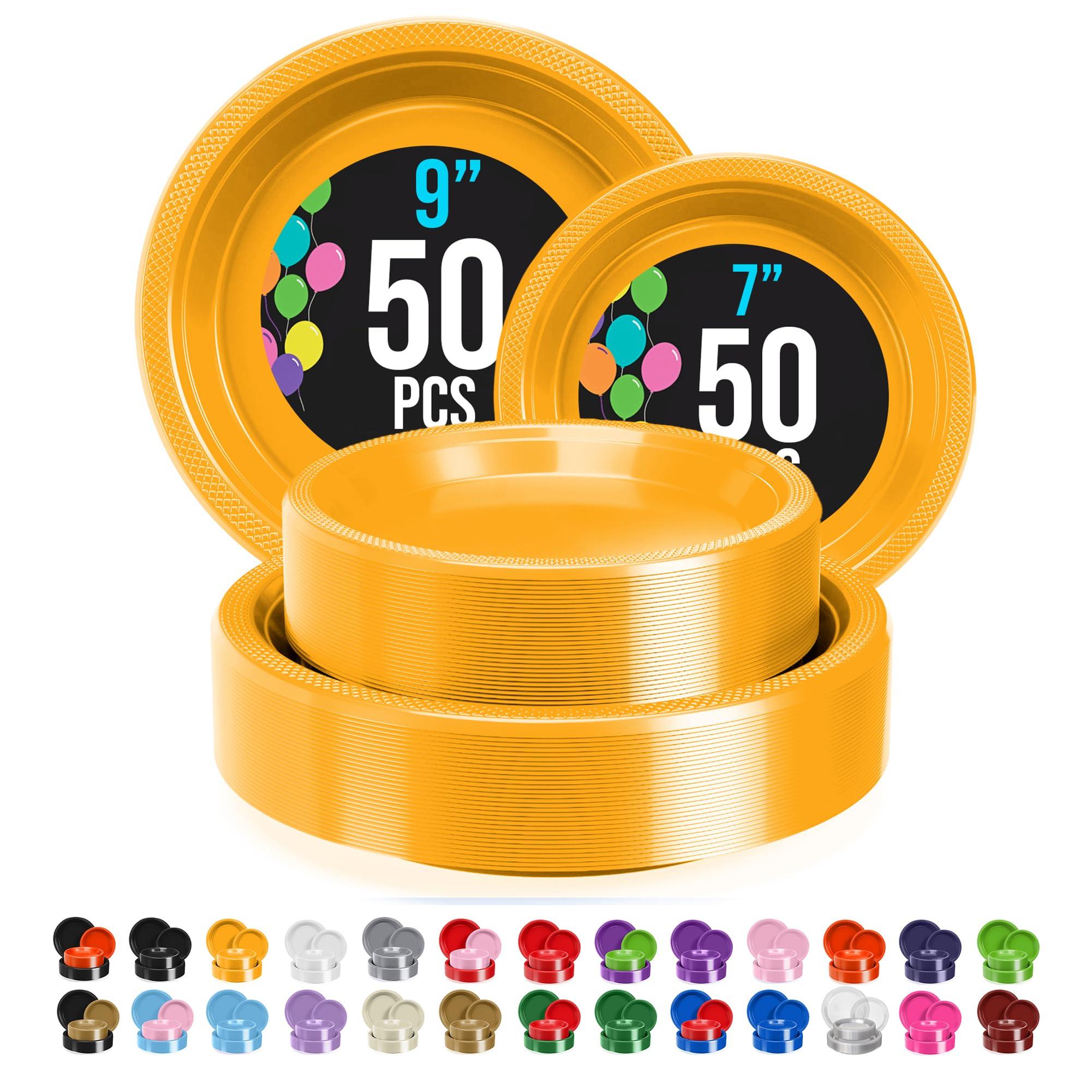 - Includes: Each pack comes with 50 Yellow 9 inch dinner plates & 50 Yellow 7 inch dessert plates These plates may be used as dinner plates or cake plate and also make a great use as picnic supplies. Having these will complete your plastic dinnerware collection.