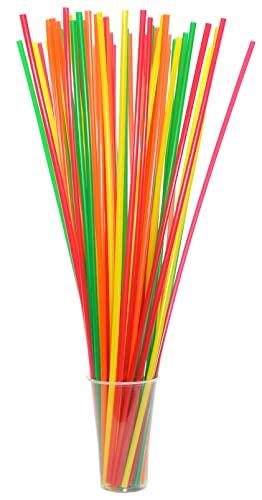 18" long x approximately 1/4" in diameter. About 200 assorted bright colored straws per package. Just right for those tropical Volcano Bowl drinks. Colors and assortment may vary.