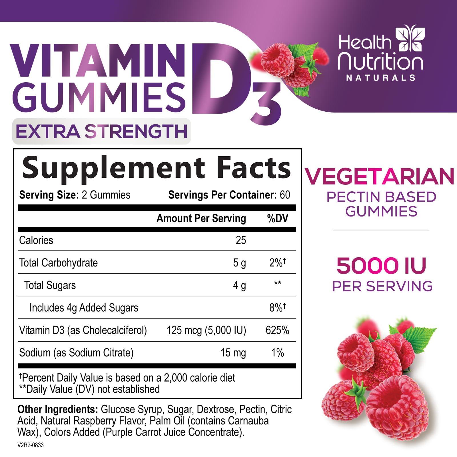 - High Potency Vitamin D3 5000 IU: Each gummy is packed with a significant 5000 IU (125 mcg) of Vitamin D3, essential for supporting bones, teeth, muscles, and supporting your immune system