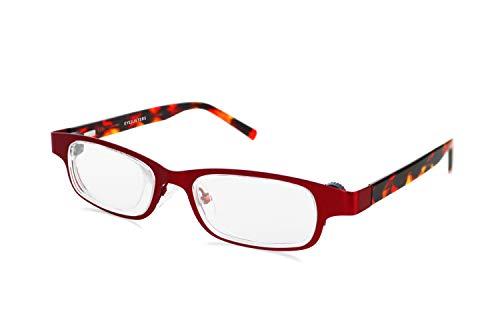 No need for expensive reading glass for different tasks! With the new advanced Eyejusters adjustable focus reading glasses, you can change the focus of the lenses from plus 0.50 to plus 4.00 D at any time to suit what you're doing. It's like having multiple pairs of reading glasses in one. All you need to do is put them on, and turn the dial on each side of the frame, and the lenses will adjust to your desired focal point. The high-quality frames include spring hinges, which can help adapt frames to your face and make removing and putting them on easier. Eyejusters are positive power and are only for nearby vision, such as reading, computer use, DIY and hobbies. They do not correct for distance vision (myopia or hyperopia) and are not recommended for driving. This highest-powered reading glasses lens is available without a prescription. It comes with a magnetic close hard case and a microfibre cleaning cloth. Ruby red color.