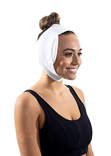- SOFT, COMFORTABLE COMPRESSION: Our incredibly comfortable face wrap and post surgery ear pillow stabilizes and supports you after an ear surgery, facial surgery, neck lift, chin lift, or other facial procedure. The 1 cotton covered foam ear pads are super comfortable, incredibly soft stay secure on your head with an elastic Velcro strap. Contoured thumbnail cutout under the chin for neck relief. American Made in US