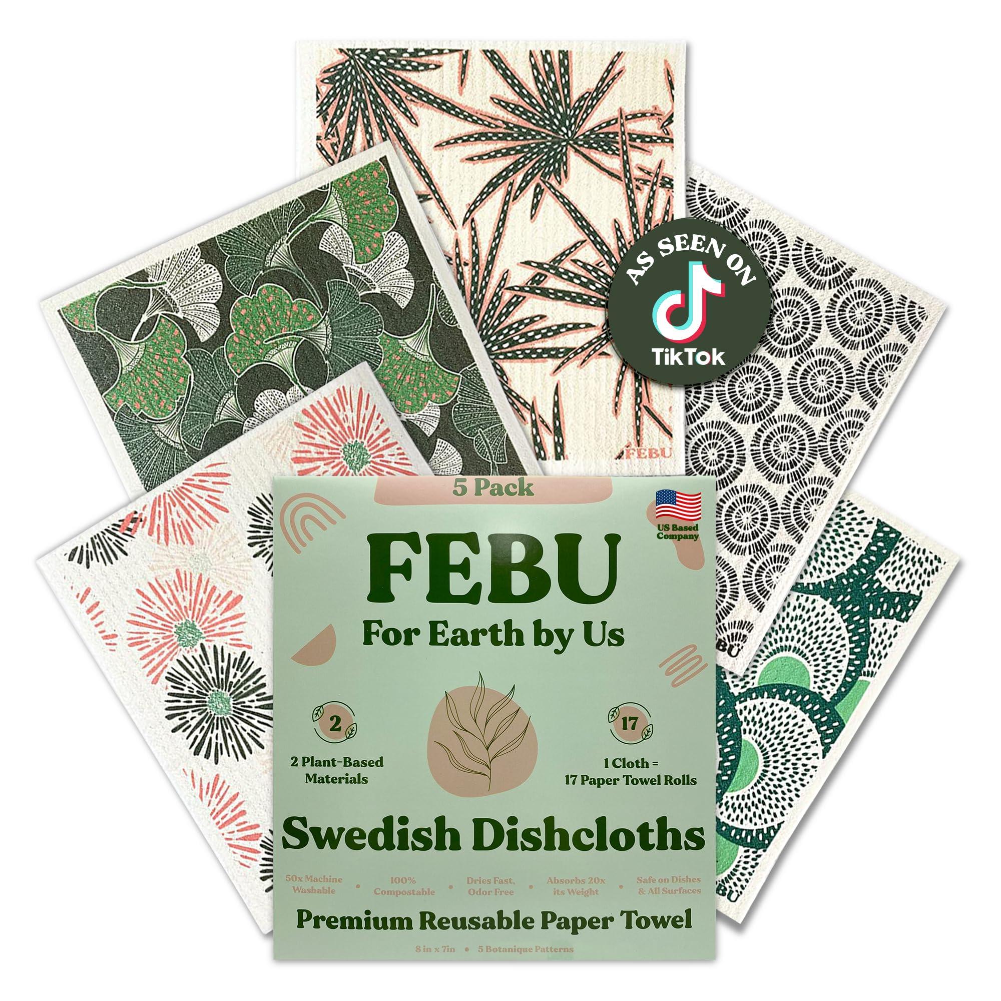 FEBU FEBU Swedish Dishcloths for Kitchen | 5 Pack Botanique Reusable Paper Towels Washable | Swedish Dish Towels | Non-Scratch Cellulose Sponge Cloths | No Odor, Biodegradable Cleaning Cloths