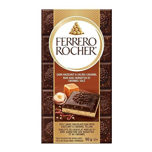 Ferrero Rocher Premium Chocolate Bar, Dark Chocolate Hazelnut & Salted Caramel, 90g/3.15 oz. Bar Smooth chocolate, crunchy hazelnut pieces and exquisite creamy filling combine in a sophisticated indulgence. The blend of smooth dark chocolate coating together with crunchy roasted hazelnuts and an exquisite salted caramel creamy filling for an experience that delights all the senses. Let the journey begin: distinctive layers of textures will take your taste buds through an irresistible chocolate experience. Made with a combination of carefully selected ingredients, Ferrero Rocher bars are sophisticated chocolate bars that offer a new informal way to enjoy a multi sensorial experience and celebrate everyday moments. Smooth Chocolate. Dark Hazelnut with 55% Cocoa in the outer layer. Crunchy Hazelnut pieces. Exquisite creamy salted caramel filling. 90g Large Chocolate Bar
