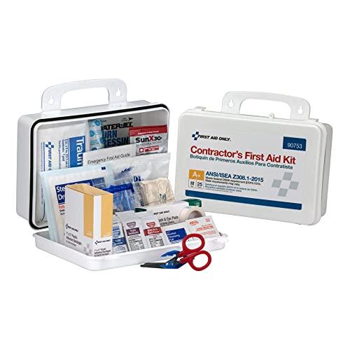 The 25 Person ANSI A+ Type III Contractor First Aid Kit in the plastic carrying case contains 126 pieces to treat on the job injuries. The contents of this kit exceed the 2015 ANSI Class A requirements . The weatherproof storage case has two latches to keep the case closed and a handle to facilitate transportation to the site of an injury. The case also includes mounting holes in the handle for mounting the case on a wall or other flat vertical surface.