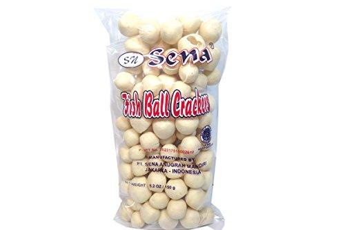 Sena Fish Ball Crackers (Getes Ikan) in 5.2oz (150g) pack. Very smooth texture and with less salt and no added MSG. Product of Indonesia. Halal Certified .