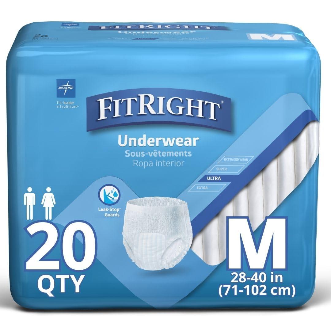 - Pack Size: 4 packs each contain 20 medium-sized FitRight Ultra Adult Protective Underwear, fitting waists measuring 28-40 inches, with heavy absorbency, ideal for hospital and nursing home supplies