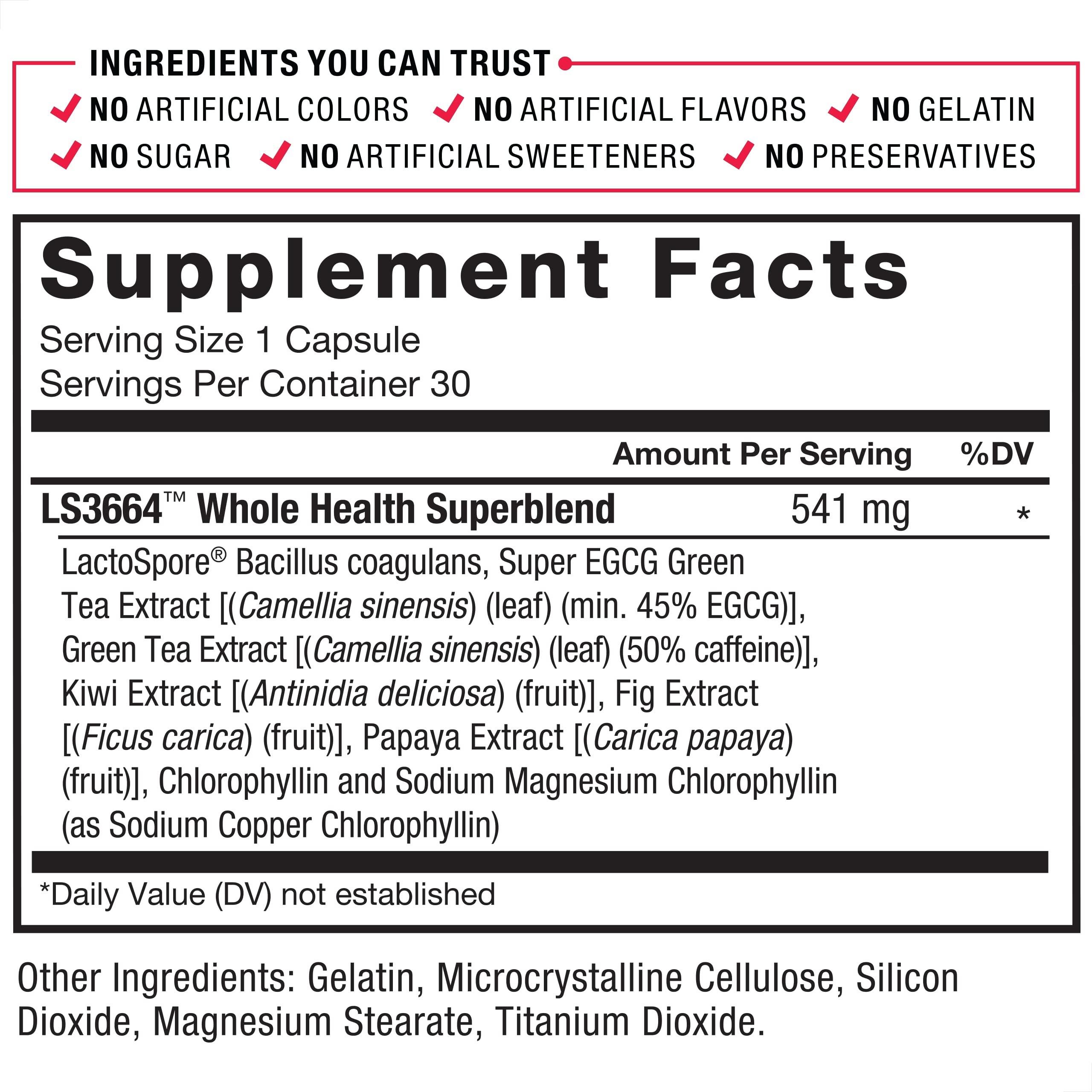 The innovative compound LactoSpore helps ease symptoms associated with occasional diarrhea, constipation, gas, and bloating. At the same time, it promotes the growth of beneficial flora, helping to reduce the proliferation of harmful bacteria. LactoSpore is scientifically engineered to survive the harsh environment of your gastrointestinal system to provide maximum digestive benefit.