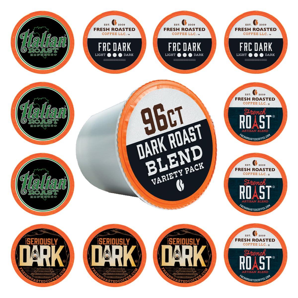 A dark roast lover's dream come true! This variety pack of our dark roasted artisan blend coffee pods contains: Seriously Dark Roast FRC Signature Dark Roast French Roast Italian Roast This single-serve coffee is compatible with many popular K-Cup brewing systems including 2.0, and K-Supreme. Keurig, K-Cup, and K-Supreme are registered trademarks of Keurig Dr Pepper Inc. Fresh Roasted Coffee LLC is not an affiliate nor licensee of Keurig Dr Pepper Inc. Kosher certification by OU Kosher