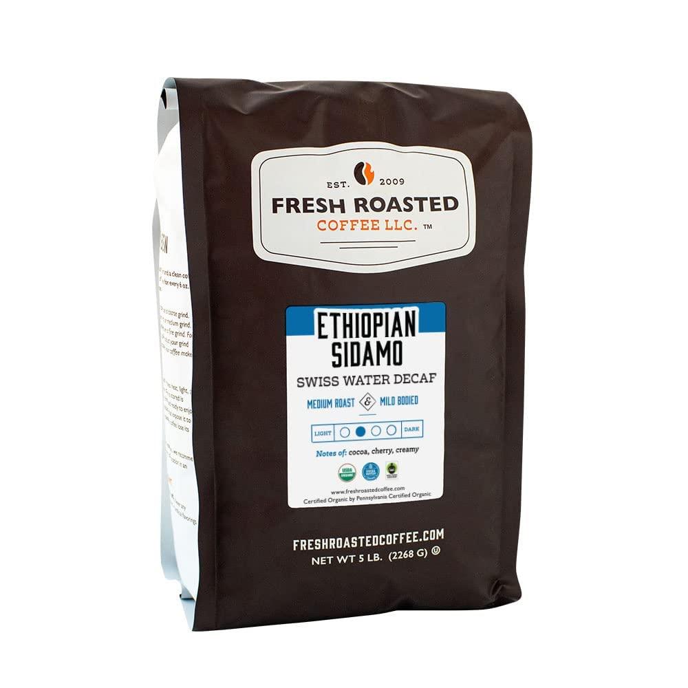 Fresh Roasted Coffee Fresh Roasted Coffee, Fair Trade Organic Ethiopian Sidamo Swiss Water Decaf, 5 lb (80 oz), Kosher, Medium Roast Whole Bean