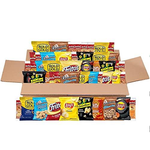 Bundle Includes: 3 Lays Classic Potato Chips 1 Ounce., 3 Lays BBQ Flavored Potato Chips 1 Ounce, 3 Fritos Original Corn Chips 1 Ounce, 3 SunChips Harvest Cheddar Flavored Multigrain Snacks 1 Ounce, 6 Rold Gold Tiny Twists Pretzels 1 Ounce, 6 Munchies Peanut Butter on Cheese Crackers 1.42 Ounce, 6 Munchies Peanut Butter on Toast Crackers 1.42 Ounce, 4 Munchies Honey Roasted Peanuts 1.375 Ounce, 4 Munchies Salted Peanuts 1.625 Ounce, 4 Grandmas Mini Sandwich Vanilla Cremes 2.12 Ounce, 4 Grandmas Mini Chocolate Chip Cookies 2 Ounce, and 4 Smartfood White Cheddar Flavored Popcorn bags 0.625 Ounce.