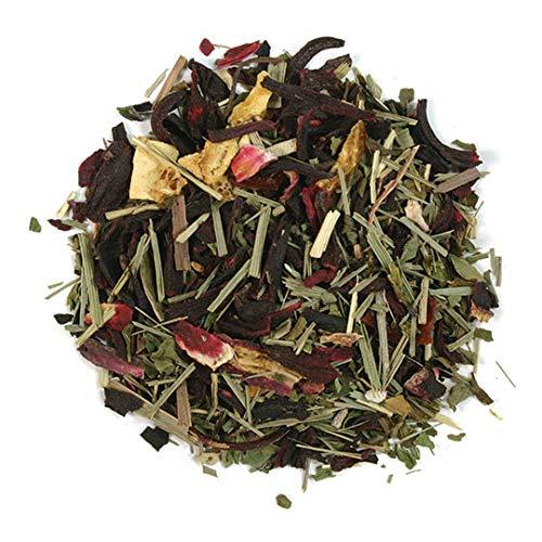 Blades of lemon grass, red rosehips, hibiscus petals and orange peel. Fragrant, sweet lemony aroma. Infusion is a beautiful pinkish purple.