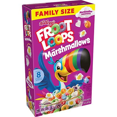 Follow your nose to delicious bursts of fruity flavor in Kellogg's Froot Loops Original with Marshmallows sweetened multi-grain breakfast cereal. Dig into vibrant, colorful crunchy O's made with tasty, natural fruit flavors and marshmallows. It's like a rainbow in every bowl! Fun to eat for adults and kids, this low-fat, healthy cereal is a good source of eight vitamins and minerals per serving; The entire family can enjoy a bowl with milk or a dairy alternative in the morning, afternoon or as a late-night treat. Enjoy sweet cereal milk after a delicious bowl of Froot Loops cereal. Perfect for snacking by the handful at work, as a school snack, in the car, and simply on the go. Always have this sweet cereal handy, add fruity goodness to any lunch box, tote bag, or backpack. Any time you want to include a flavorful pick-me-up in your day, reach for a box of Kellogg's Froot Loops cereal.