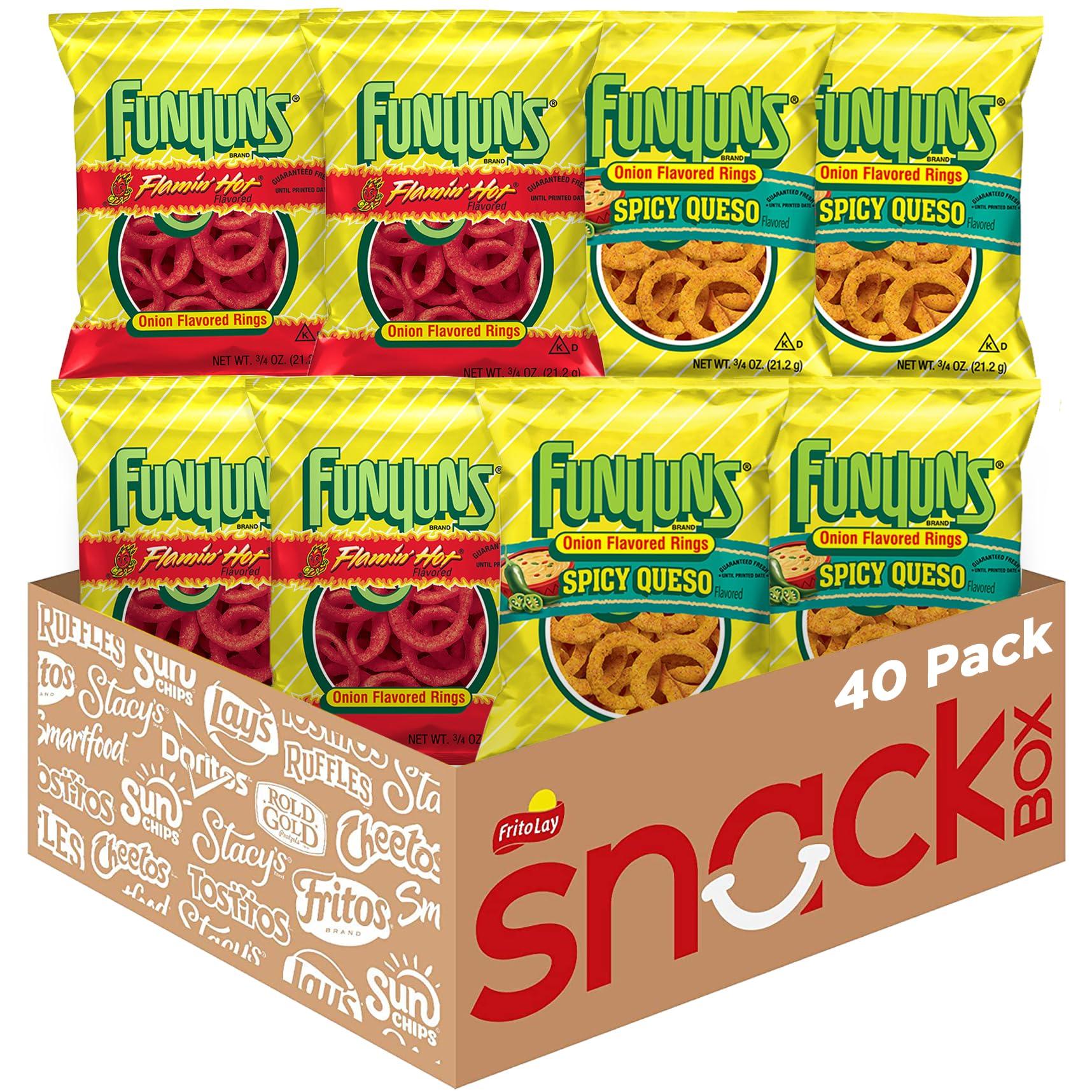 - Includes 40 individually wrapped snacks: (20) bags each of FUNYUNS Spicy Queso and (20) bags each of FUNYUNS Flamin' Hot, Packaging May Vary