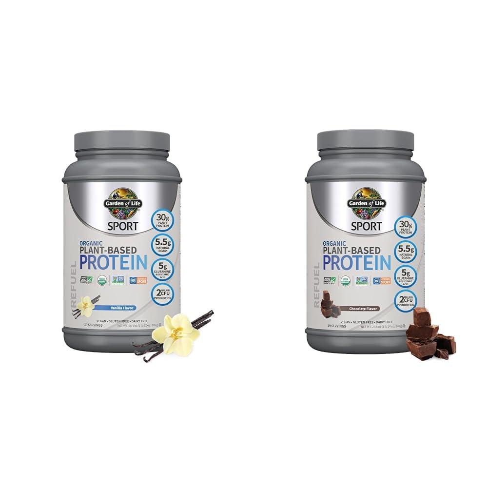 This bundle includes two 19-serving containers of Garden of Life's Organic Vegan Sport Protein Powder, available in both Vanilla and Chocolate flavors. Both protein powders provide 30g of plant-based protein per serving from organic pea and other certified organic sources to aid post-workout muscle recovery and repair. They also contain over 5g of BCAAs, glutamine and glutamic acid. The organic muscle recovery blend in both products includes antioxidant-rich organic tart cherries, apples, turmeric, goji berries and blueberries to promote faster recovery times. A probiotic blend offers immune system support during intense training. With quadruple third-party certifications including USDA Organic, Non-GMO Project Verified, NSF Certified for Sport and Informed-Choice for Sport, these vegan protein powders contain no banned substances - just clean, whole food nutrients. They are also gluten-free, dairy-free and soy-free with no added sugars. Combining both chocolate and vanilla flavors allows you to switch up the taste while still reaping the muscle recovery and immune boosting benefits from these certified organic sport protein powders.