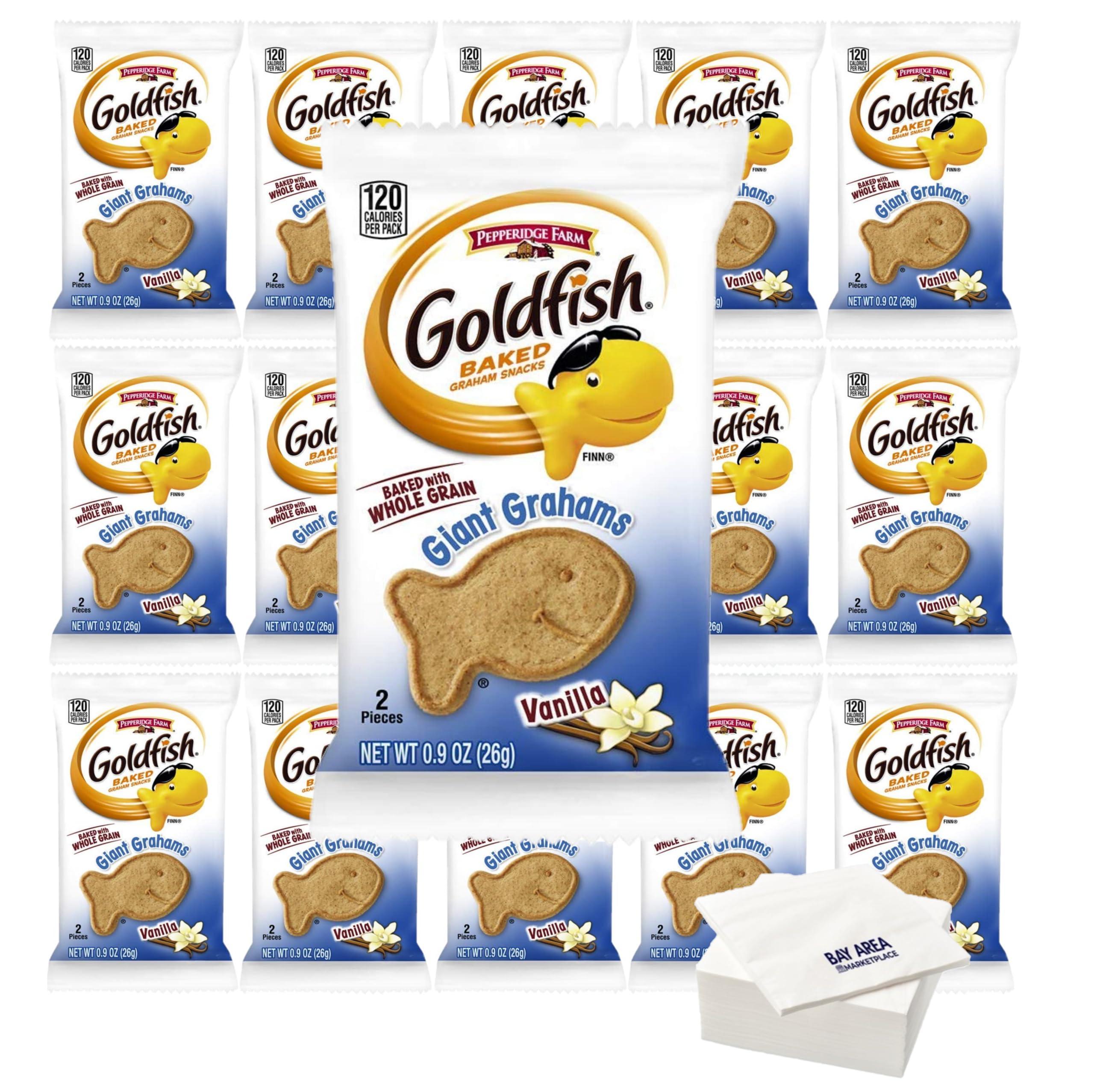 Goldfish Giant Vanilla Graham Crackers. Contains Eighteen (18) 2-Cracker Pouches. Packed with the sweet flavor of vanilla and crunch everyone loves, Goldfish grahams are whole grain-rich and have 120 calories per serving. Perfect for stocking the pantry, lunches, parties, or taking on the go!