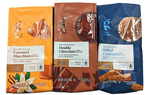 If you like dessert coffee, this is for you! This bundle features three 12 ounce bags of Good & Gather ground coffee - Caramel Macchiato, Double Chocolate, and Salted Caramel. In the mood for vanilla with your coffee? The Caramel Macchiato coffee combines the sweet, buttery caramel flavor with hints of vanilla. Need a chocolate pick-me-up? The Double Chocolate coffee features a sweet milk chocolate flavor. Craving something sweet and salty? The Salted Caramel coffee combines the buttery sweetness of caramel with salty notes.