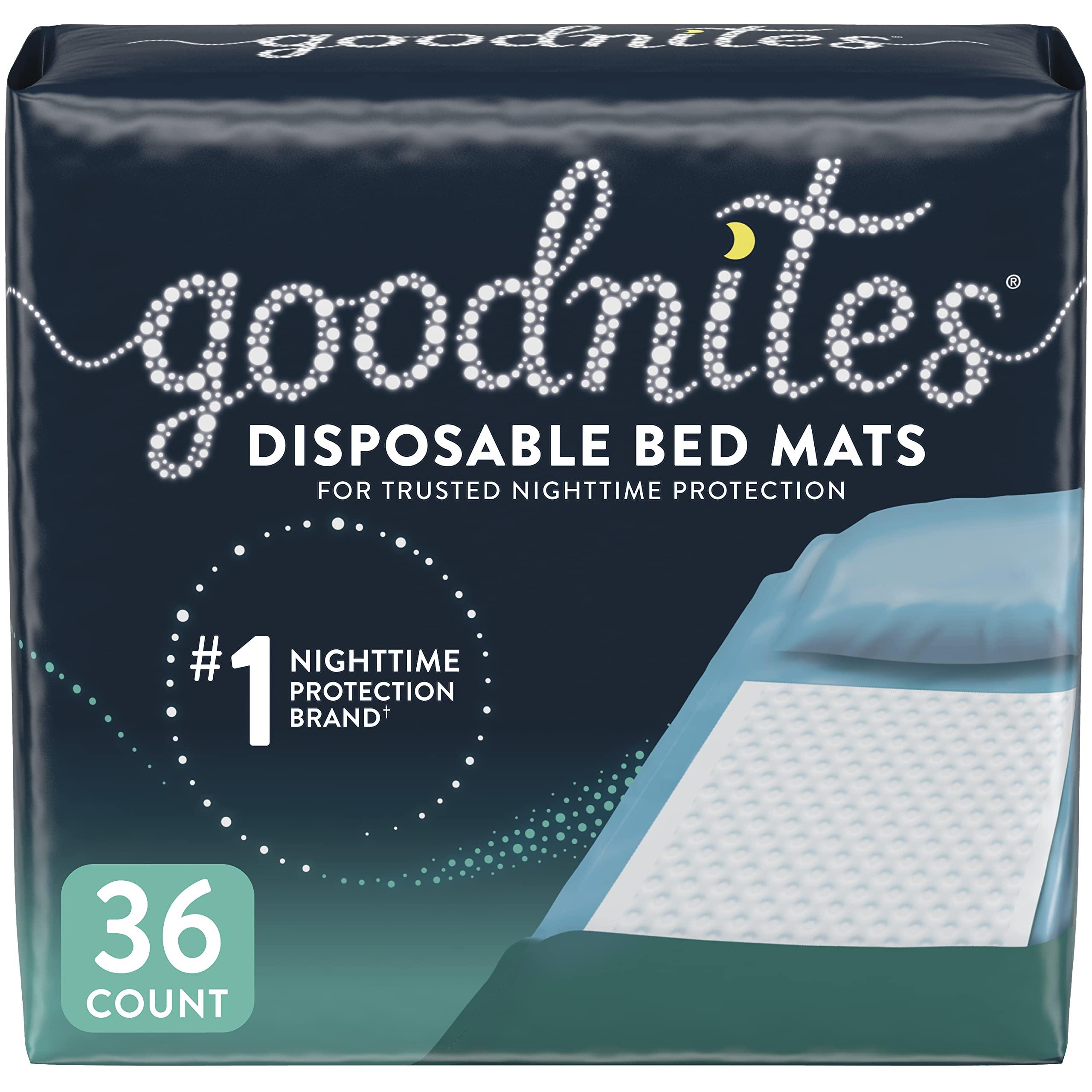 Help your child rest easy each night with Goodnights Disposable Bed Mats for Bedwetting, from the #1 Nighttime Protection Brand*. With Micro-Pocket Technology, your child's sheets will be protected. These bedwetting mats are also made with soft, quiet material, a super absorbent core and a leakage barrier to keep your child comfortable for a good night's sleep. Each Goodnites bed pad measures 2.4 x 2.8 ft. to fit a twin bed perfectly, while an adhesive backing helps keep the pad in place as your child moves during sleep. They're also hypoallergenic and dermatologist-tested. These disposable bed pads work great with children with enuresis, incontinence, autism, Asperger Syndrome, diabetes or neurological problems. Bedwetting is common, affecting 1 in 6 kids ages 4 to 12, so there's no need to worry if your child is wetting the bed. Goodnights bed pads can help ease frustrations and encourage your child's confidence by reducing late-night sheet changes. For a better night every night, simply place, peel and protect with Goodnites Bed Mats for bedwetting. Goodnites Bed Mats are eligible for Health Savings Account (HSA) and Flexible Spending Account (FSA) purchases. *Youth Pant Category