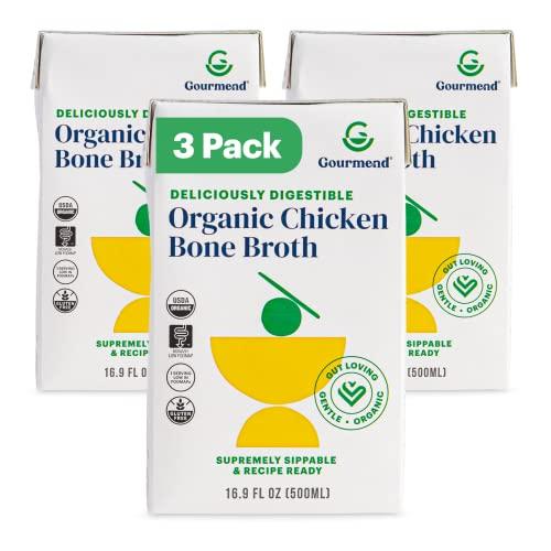 Gourmend Organic Unsalted 16.9oz Chicken Bone Broth (3 Pack) 7 Ingredients, Low FODMAP Certified, Filler Free, Gluten Free, Onion & Garlic Bulb Free