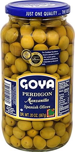 Goya Perdigon Manzanilla Spanish Olives, 20 oz. | Goya Perdigon Manzanilla Spanish Olives are known for their rich taste, firm texture and tangy flavor. They are another treasure from Andalucia, Spain. Perfect for cocktail picks and hors d'oeuvres, straight out of the jar, or as an ingredient for salads, stews and empanadas among others. Winner of the ChefsBest Award of Excellence for its quality and taste.