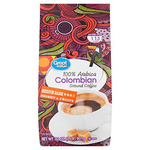 - Great Value Colombian coffee delivers an enticing aroma and flavor accentuated by the volcanic rich soil of Colombia. Made with 100% Arabica coffee, this premium blend is sourced exclusively from Colombia and then medium roasted to deliver a rich flavor with excellent balance of body and acidity.