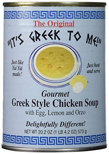 Gourmet Greek Style Chicken Soup (Avgo-Lemono Soupa). With egg, lemon and orzo. -improved heartier recipe -larger portion 18.6 oz per can -Convenient pop top style can Just heat and serve. Ingredients: water, enriched orzo pasta, whole eggs, chicken base, corn starch, cooked chicken meat, lemon juice concentrate, chicken fat, citric acid, soy protein isolate, salt, natural flavor, sodium phosphate. Allergens: wheat, egg, soy. Packed in the USA.