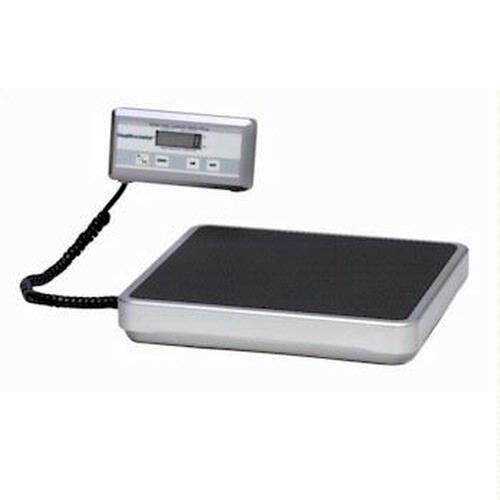 400 lb capacity with 8 oz readability and large 12 x 12 inch non-skid platform. Remote LCD display on 9 foot cord can be wall or desk mounted. With tare and auto off plus low battery indicator.