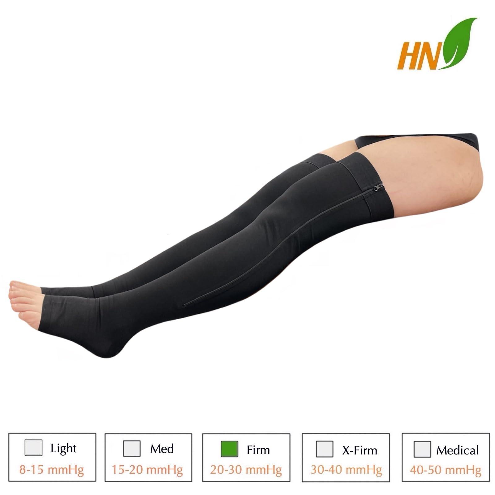 Provides 20-30 mmHg firm compression grade support for full leg circulation. These thigh high compression sleeve provides full length support for circulation and swelling relief. Helps reduce leg fatigue and swelling as it helps energize for better movement. Made with high quality material for long lasting results. Silicone band prevents from slipping off and better support. The option to select with or without the built-in zipper for easier compression support.