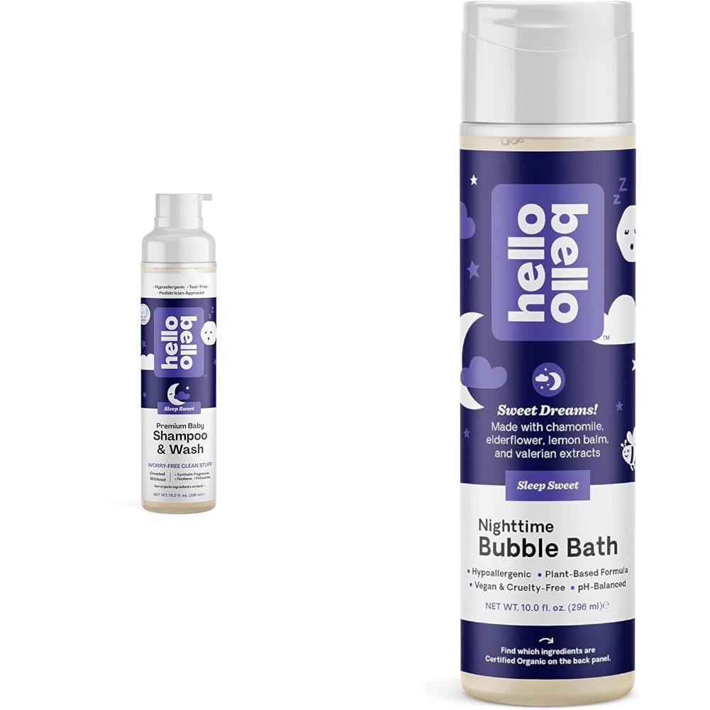This Hello Bello bundle includes a 10fl oz bottle of Nighttime Shampoo & Body Wash and a 10fl oz bottle of Nighttime Bubble Bath. Both products feature a gentle formula made without sulfates, parabens, phthalates, and other harsh ingredients. The Nighttime Shampoo & Body Wash is an extra gentle cleanser infused with jojoba seed oil and soothing botanical extracts. It features a sweet, sleep-promoting scent with hints of floral, lemon, and coconut. This shampoo and body wash provides a calming sensory experience during bath time to help prepare little ones for a peaceful night's sleep. The Nighttime Bubble Bath complements the shampoo and body wash with the same sleep-inducing scent. It creates mounds of bubbles built to last long enough to entertain without overstimulating before bed. This dermatologist and pediatrician approved formula moisturizes and nourishes skin while keeping bath time fun. Together, these thoughtfully formulated sleep-friendly products provide a soothing, aromatic bubble bath and hair/body wash routine. This bundle is ideal for delicately cleansing little ones' skin and hair before tucking them in for sweet dreams.