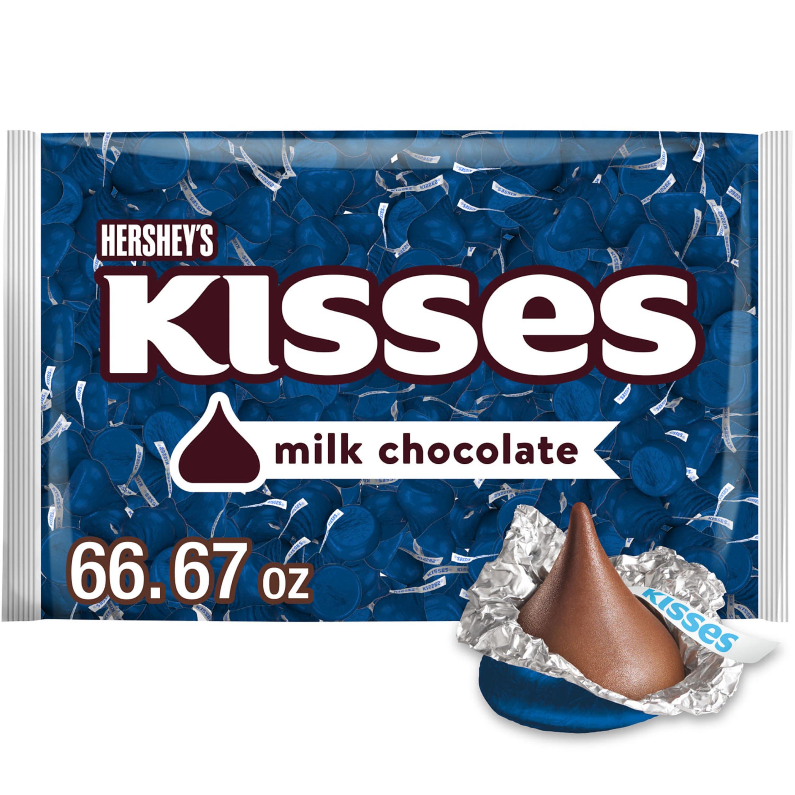 - Contains one (1) 66.67-ounce bulk bag of HERSHEY'S KISSES Milk Chocolate Candy in Dark Blue Foils