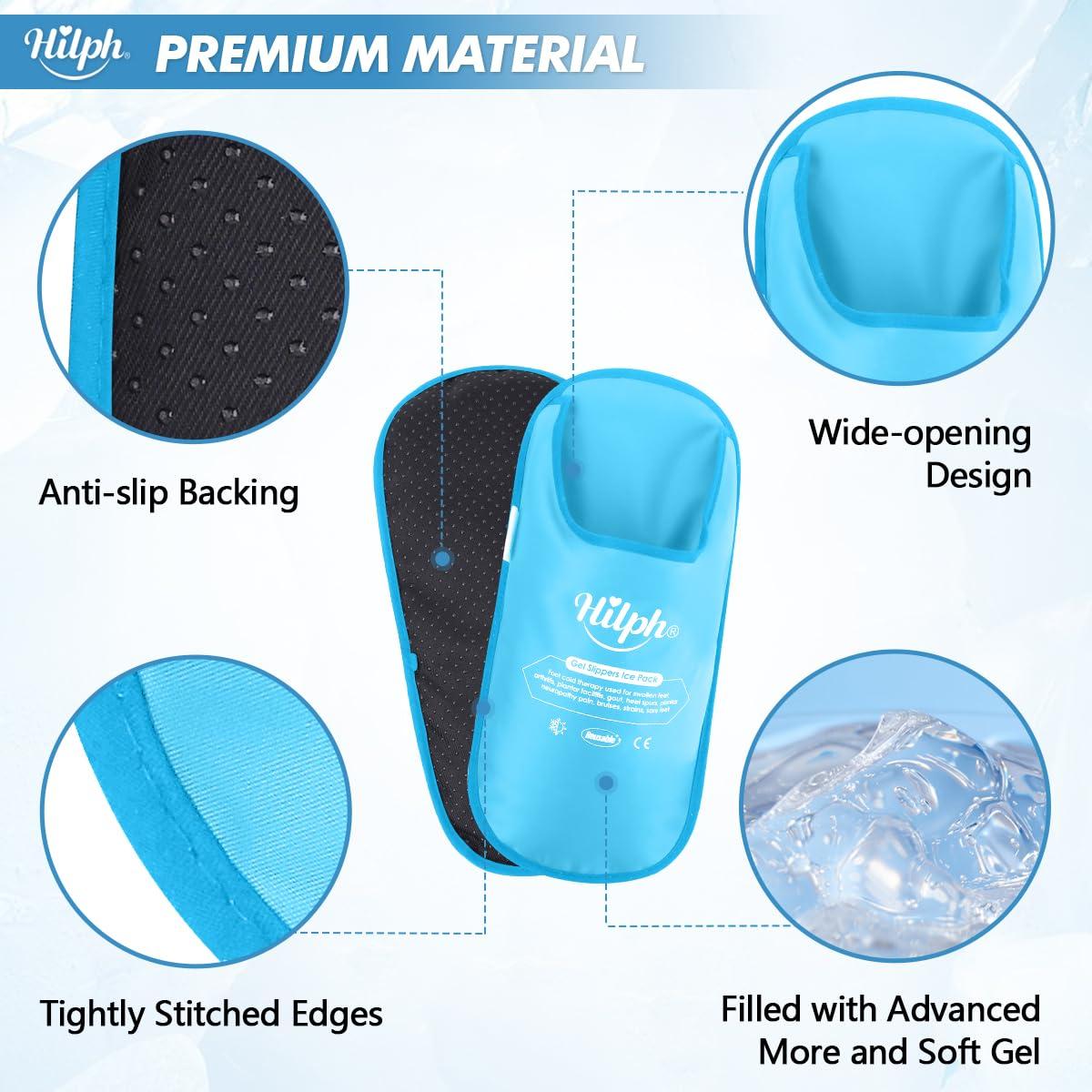- [Fits Most Foot & Easily Use] - Hilph ice pack slippers with wide opening design easy for people with sore feet to put on and take off, they are roomy enough to wear with socks if you dont want direct contact, no worry about squeezing your feet. Ice slippers supports up to 6.5" width foot circumference, ensure swollen feet from pregnancy or feet in recovery after surgery can easily fit. Ideal for most average to men and plus size women.