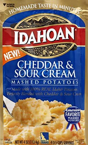 Whip up delicious, rich mashed potatoes in minutes with Idahoan Cheddar & Sour Cream Mashed Potatoes! Our instant mashed potatoes are always made with 100-Percent Real Idaho potatoes. Perfect for a variety of wholesome recipes, Idahoan Cheddar & Sour Cream Mashed Potatoes are easy to prepare and ready in minutes. Simply heat water on stovetop or in a microwave, add the entire pouch of mashed potatoes, and voil! Each order includes 1 (4oz) pouch with 4 (1/2 cup) servings. Our mission of innovation will continue to bring you quality 100-percent REAL Idaho potatoes in all the ways you love. Whether its quality mashed potatoes, soups, casseroles or hash browns, in a pouch, bowl, cup or more, Idahoan Foods will continue to bring you Homemade TasteEvery Time