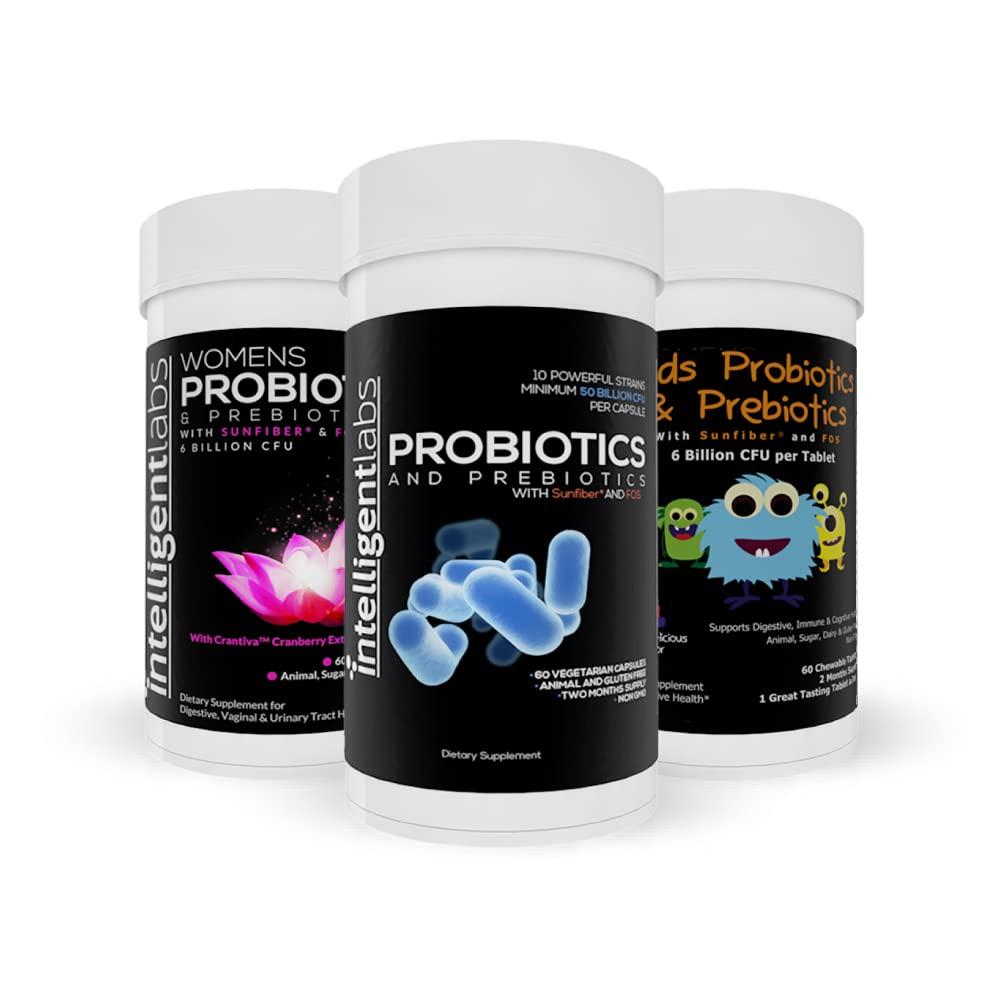 - Digestive Health Support for the Whole Family Weve got the complete lineup of Intelligent Labs Probiotics with Prebiotics in this bundle! Restore balance to your whole familys gut microbiota with our patented, acid, bile and heat-resistant probiotics. To benefit from probiotic action, simply take one capsule a day!
