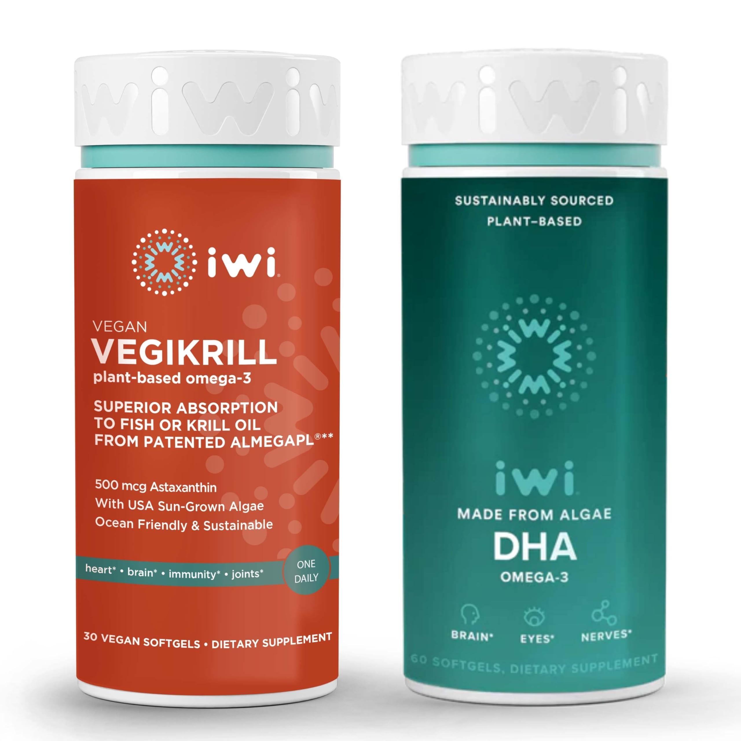 - More Algae-Based Nutrition: Our Vegikrill Omega-3 and DHA Bundle includes 1 bottle of Vegikrill Omega-3 and 1 bottle of DHA Omega-3, 30 servings each. iwi life products are designed to be stacked. Meet your health goals faster by layering the nutrition in iwi lifes focused formulas