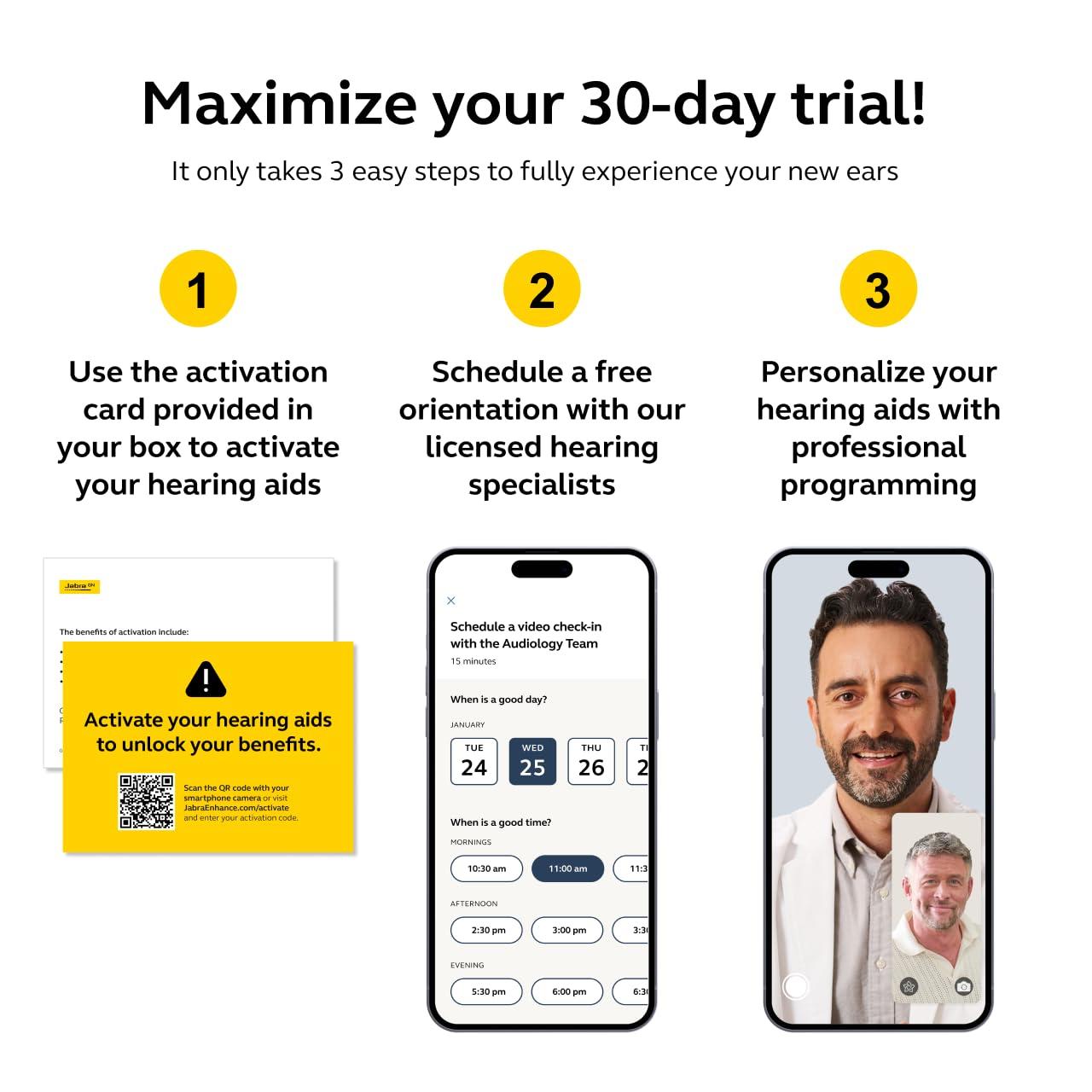 - Premium, Lincensed Care: Jabra Enhance Select 50R hearing aids include access to our dedicated Audiology Team from initial setup to 3 years of personalized follow-up care, also including adjustments and video chats 7 days a week without leaving home