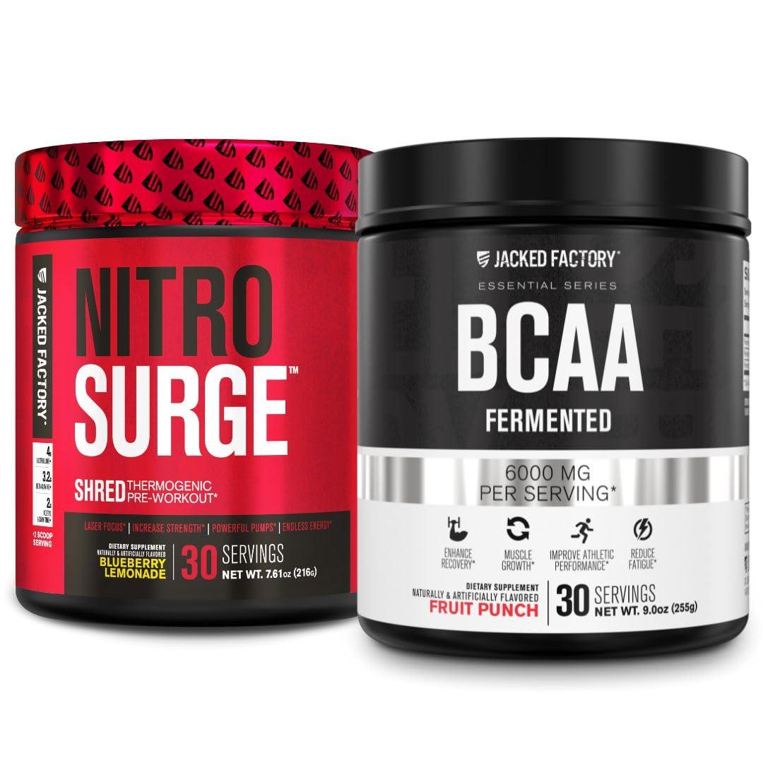 - Nitrosurge Shred & BCAA Bundle - Unbeatable Value: the ultimate Pre & Post Workout bundle. Nitrosurge Shred is a creatine-free, fat burning pre-workout for men and women, formulated with evidence-based ingredients that boost nitric oxide (NO), energy, and help with body recomposition. Jacked Factory BCAAs provides 6000mg of 2:1:1 branched-chain amino acids to help athletes, bodybuilders, gym-goers, and fitness enthusiasts support muscle recovery, reduce muscle tissue breakdown, and enhance perf