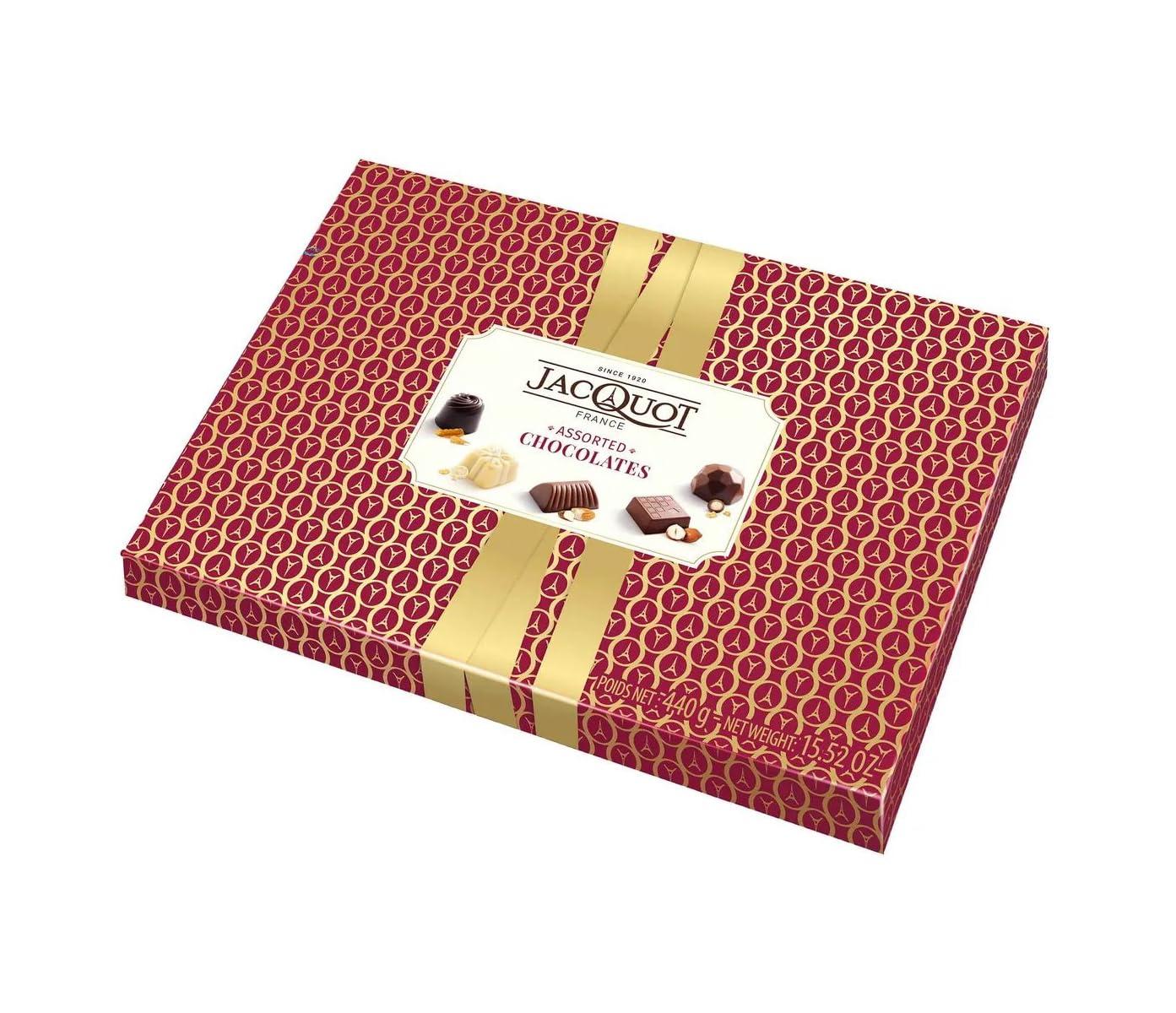 This beautiful chocolate box by Jacquot contains 40 fine assorted chocolate candies including:\nMilk chocolates filled with praline and crispy cereals, dark chocolate with truffle heart and crepe pieces, milk chocolates filled with praline, dark chocolate candies with hazelnut pieces filled with crunchy praline, milk choclate filled with praline and smooth caramel, milk chocolates filled with praline and almond pieces, milk chocolates filled with praline and hazelnut pieces, white chocolates filled with praline and crunchy cereals, milk chocolates filled with praline and crepe pieces, and dark chocolate filled with truffle, almond and crepe pieces.\nJacquot is a French chocolate manufacturer founded by Jules Pares in 1814 in Arles-sur-Tech, France. It is parrt of the Cmoi group, which is the largest chocolate manufacturer in France and is known worldwide for the quality of its products.\nCmoi sources its cocoa beans from a variety of countries including Ivory Coast, Ecuador, Sao Tom and Prncipe and Vanuatu.\nThis chocolate box is the perfect Holiday gift, chocolate gift for a birthday, Christmas, Mothers day, Thanksgiving, Valentines day or Fathers day. It is a great thank you gift, get well gift or sympathy gift as well.\nThis box of assorted chocolate candies is imported straight from France.